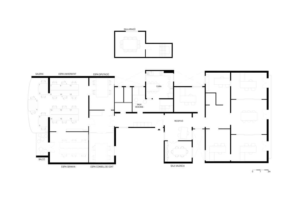 Les àrees comunitàries: la cuina i la zona de descans, es reformen amb la idea d’acollir a l’usuari i crear un espai de comunitat, de reunió. Les àrees de treball es distribueixen amb el nombre òptim de taules dissenyades a mida per obtenir el màxim de rendiment, funcionalitat i comoditat de cada sala.