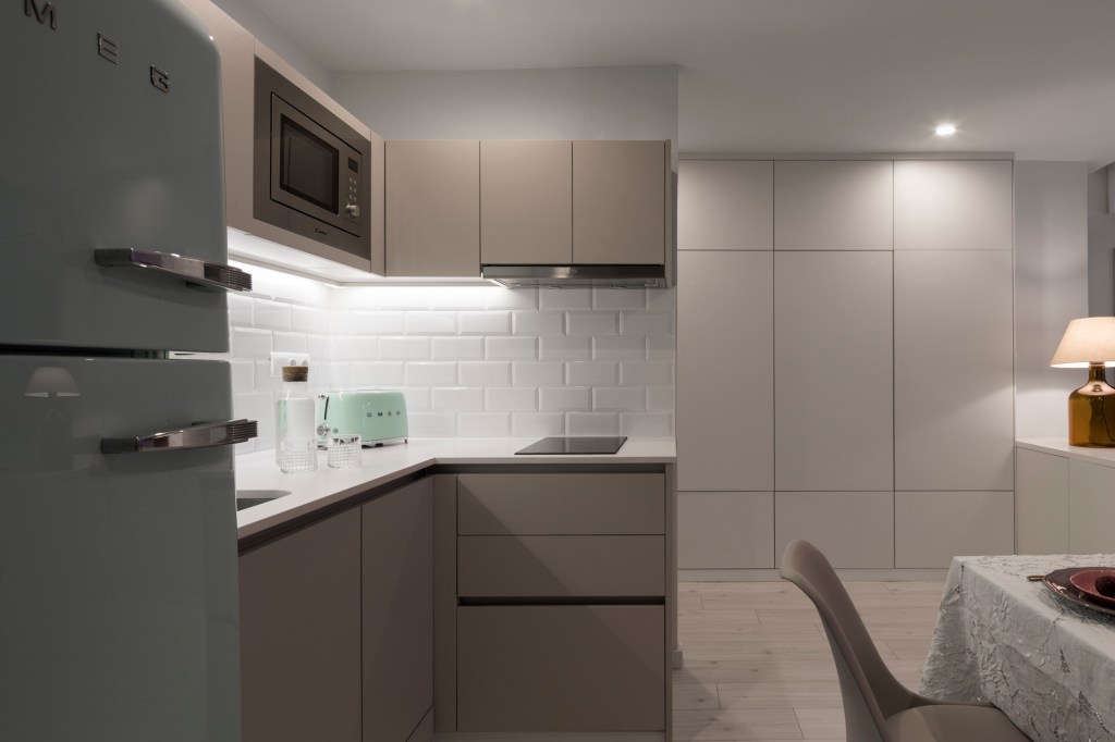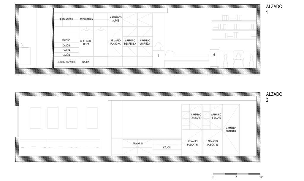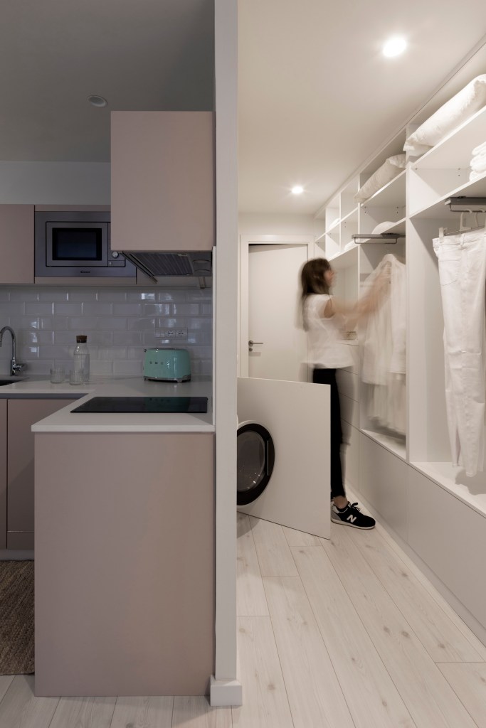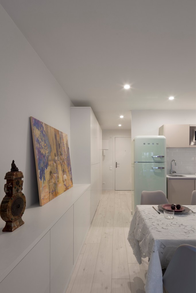 Con estas premisas, se diseña el espacio mediante paredes que almacenan al máximo, y una pared ligera que separa la zona privada: cama/estudio, de la zonas menos privada: cocina/sala de estar, y al mismo tiempo, permite colgar su colección de arte que la ha acompañado toda la vida.