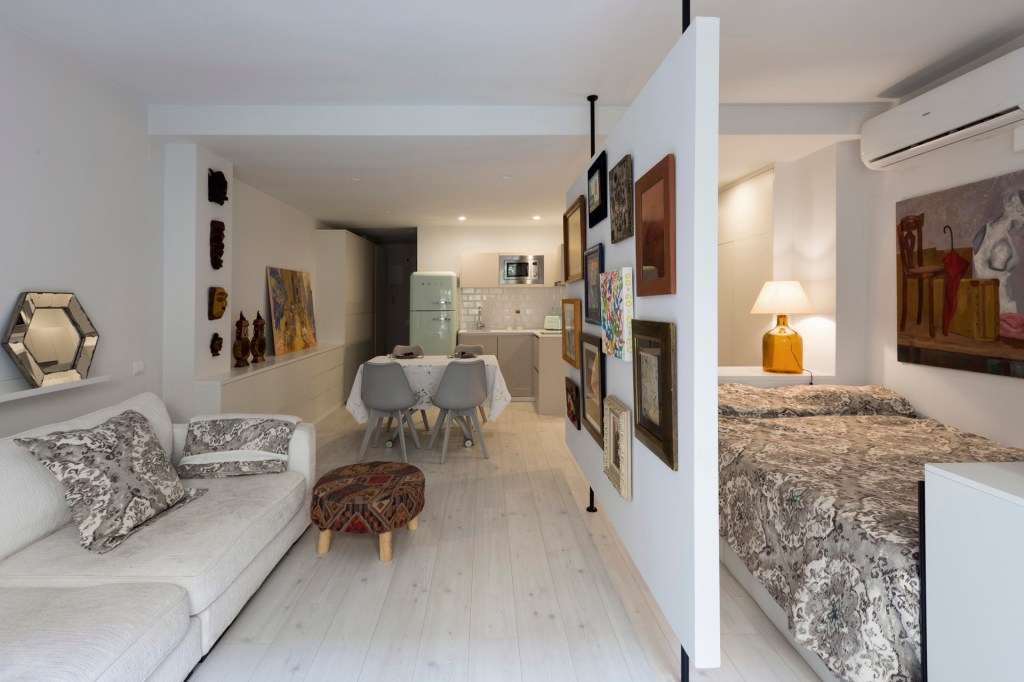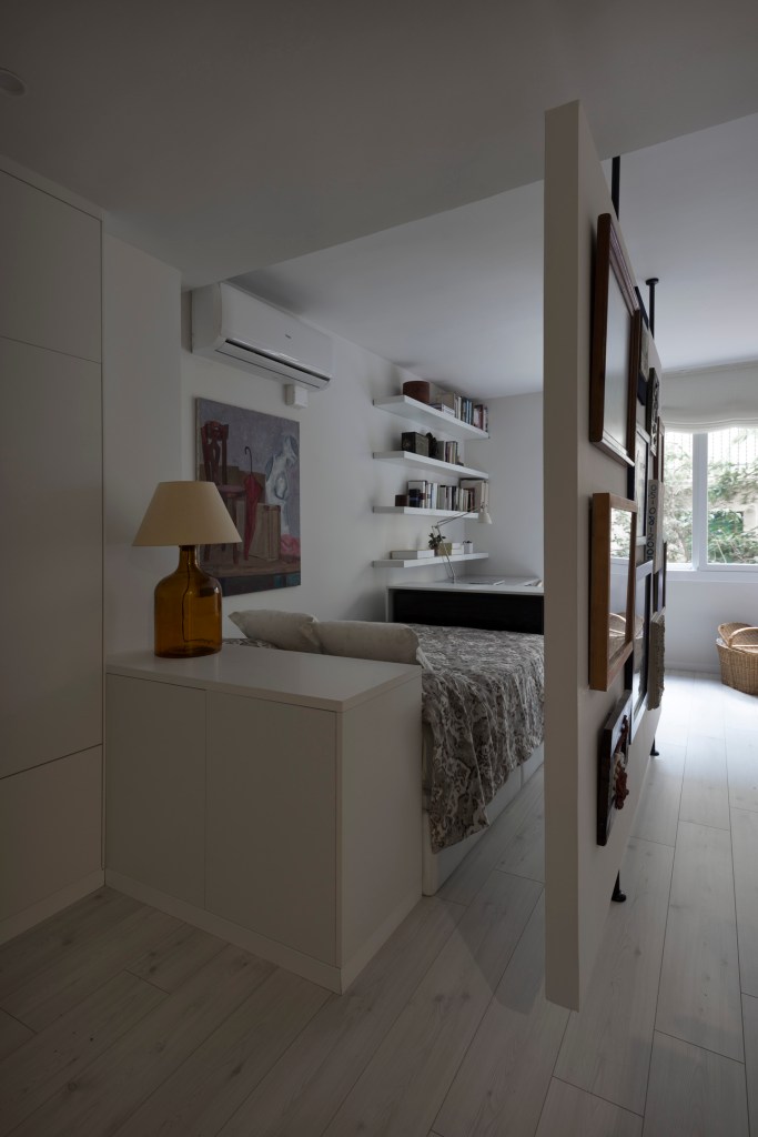 Amb aquestes premisses, es dissenya l’espai mitjançant parets que emmagatzemen al màxim, i una paret lleugera que separa la zona privada: llit/estudi, de la zona menys privada: cuina/sala d’estar, i que al mateix temps, permet penjar la seva col·lecció d’art que l’ha acompanyat tota la vida.