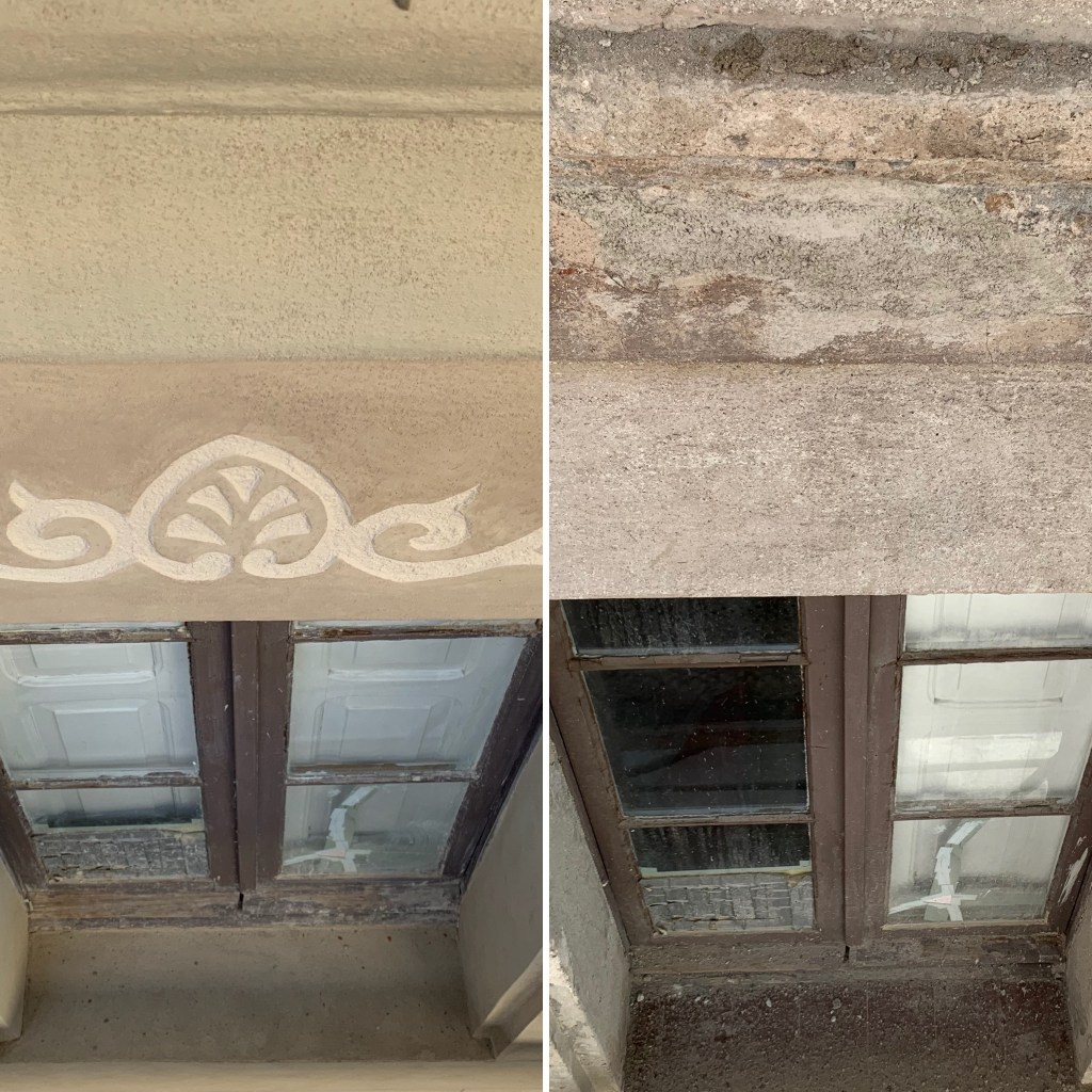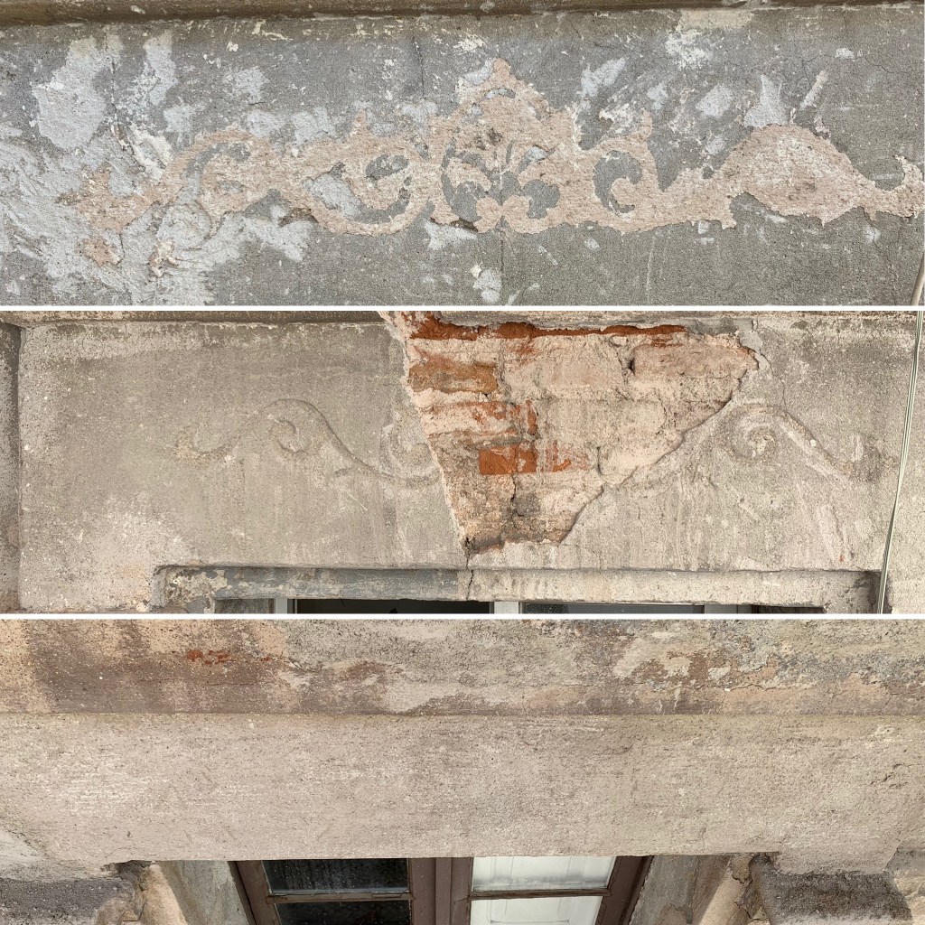 Durante este proceso nos encontramos con los dinteles de los balcones rotos y unos esgrafiados originales a la altura de los dinteles de cada planta.