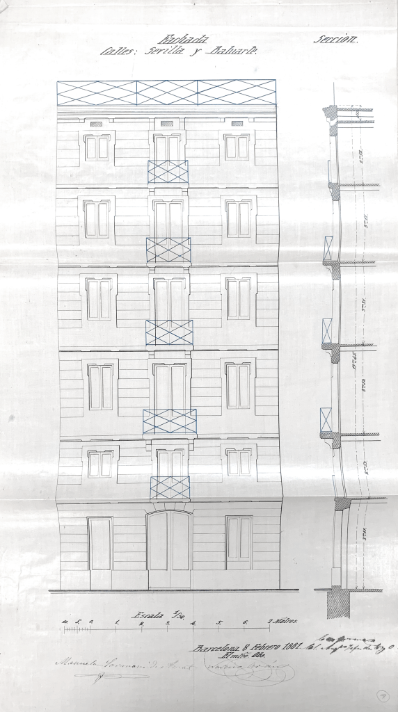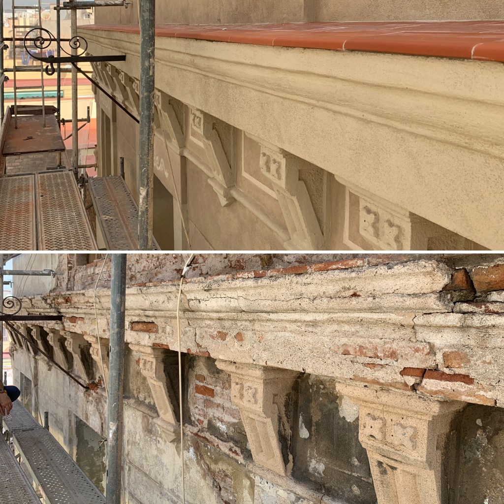 Durant aquest procés ens trobem amb les llindes de les balconeres trencades i uns esgrafiats originals a l’alçada de les llindes de cada planta.