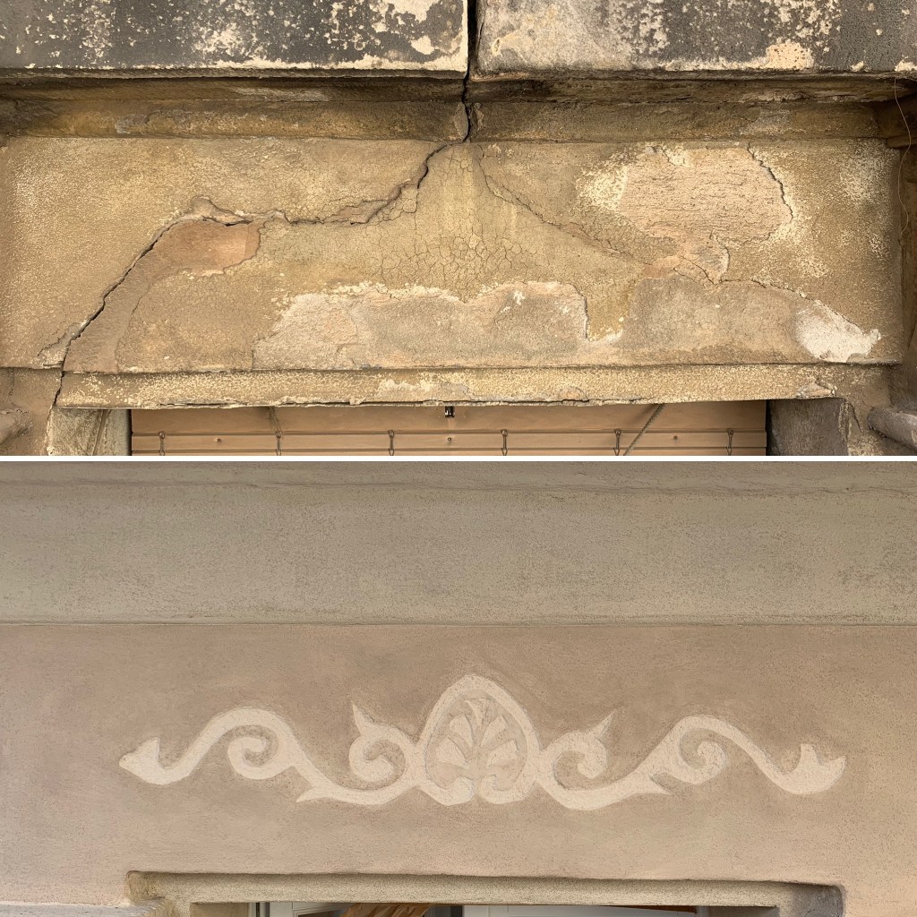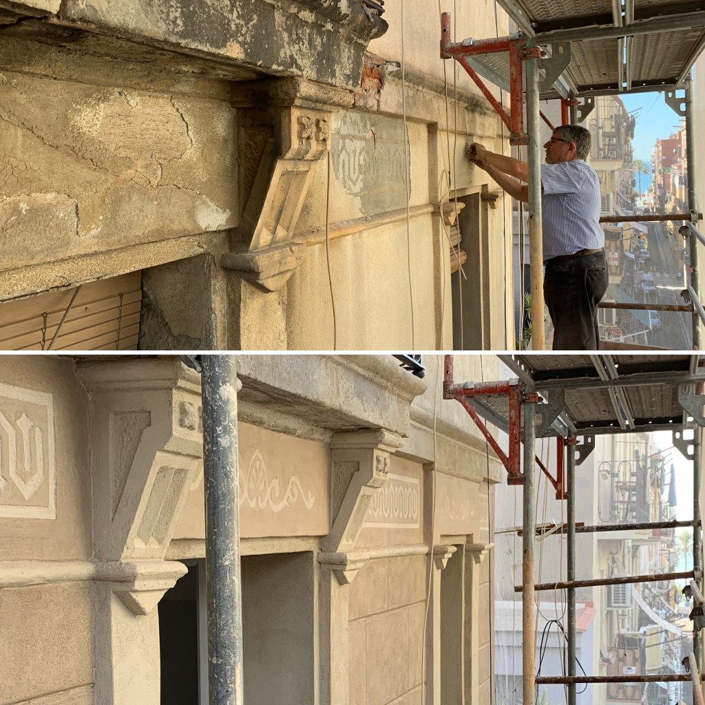 Un cop la façana neta, comencem a reforçar i a tapar les esquerdes i forats per procedir a restaurar-la amb els materials i colors originals. Refem els esgrafiats, la cornisa, les motllures, les baranes i netegem les lloses originals de pedra de Montjuïc.