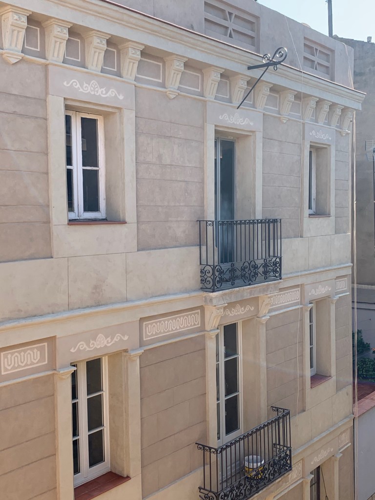 Finalment comencem amb l’aplicació del morter de calç aèria a les zones malmeses, i seguidament amb les veladures dels colors originals a tota la façana. Al morter original, un cop restaurat, també el velem per a obtenir homogeneïtat en el tot el conjunt. Es canviaran les fusteries de les finestres per a una rèplica de les originals.