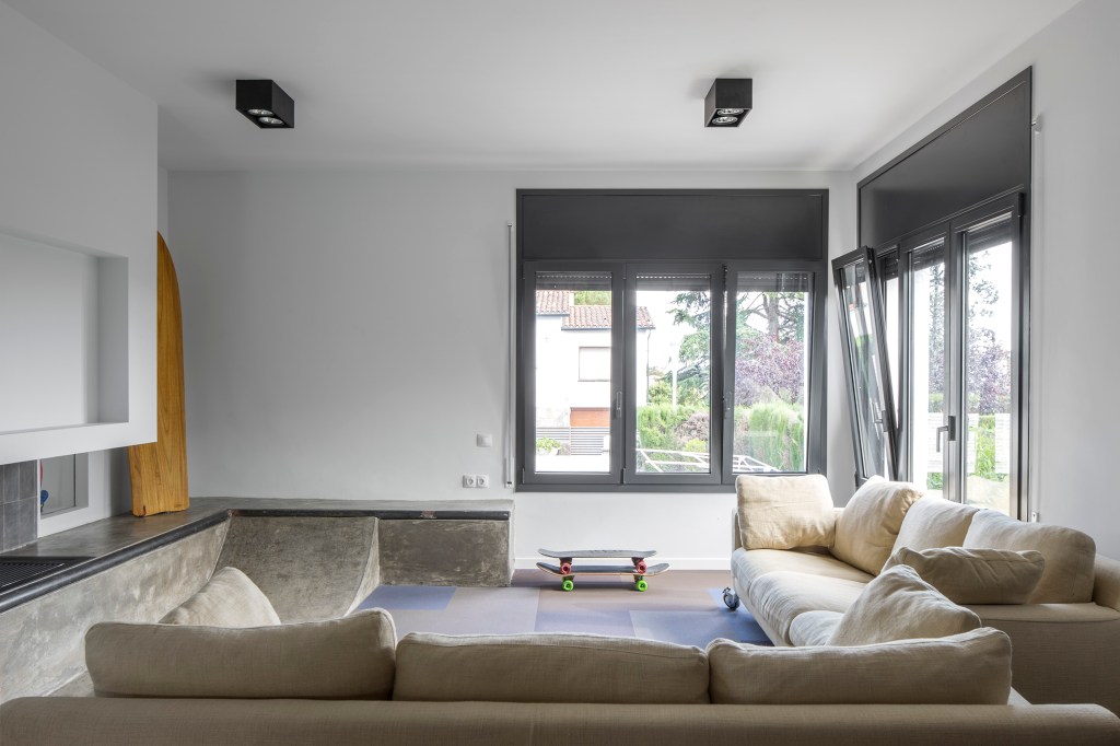 1 · El moble per la TV que a la vegada és la xemeneia, i la rampa d’skate “quarter pipe” que creua tota la sala d’estar fins a la cuina